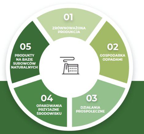 Prowadzimy zrównoważone działania, które można podzielić na 5 głównych obszarów, obejmujących m.in. odpowiedzialny biznes i ochronę środowiska. Koncentrujemy się na zrównoważonej produkcji, gospodarce odpadami, działaniach prospołecznych, ekologicznych opakowaniach i produktach z naturalnych surowców.